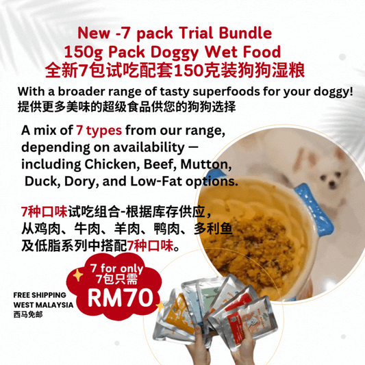 Doggy SuperFood is real, fresh and natural dog food. Freshly cooked, no preservatives. Free Sample for first purchase & Free Shipping for above RM100.